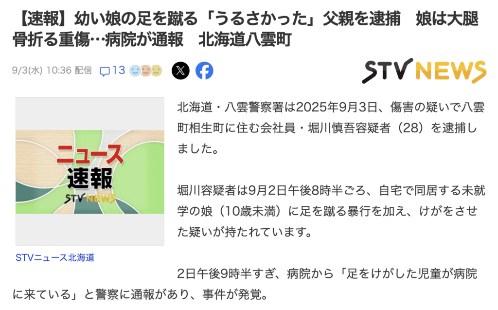 2025年9月3日、北海道・八雲警察署は八雲町在住の会社員・堀川慎吾容疑者(28)を、傷害の疑いで逮捕したと発表しました。 堀川容疑者は、同居している未就学の娘に足を蹴る暴行を加え、左大腿骨を骨折させる重傷を負わせたとして逮捕されています。 この... -